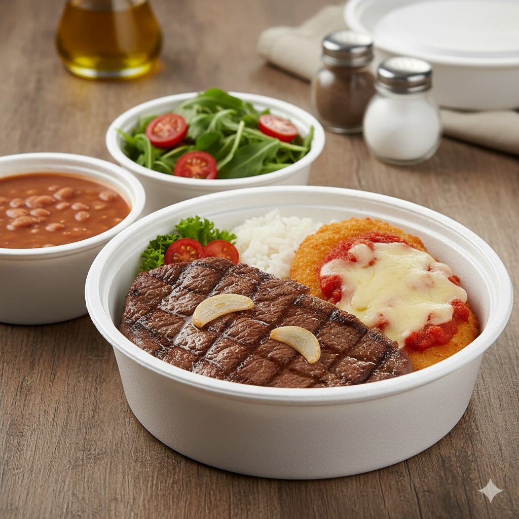 Marmita Constituída Dê : deliciosa costelinha suína ao molho bbq + bife de coxão mole à milanesa + legumes na manteiga + macarrão ao molho + arroz fresquinho, feijão delicioso e salada da época. Da nossa casa direto pra sua, com muito carinho e cuidado para entregar delicias à Vocês.