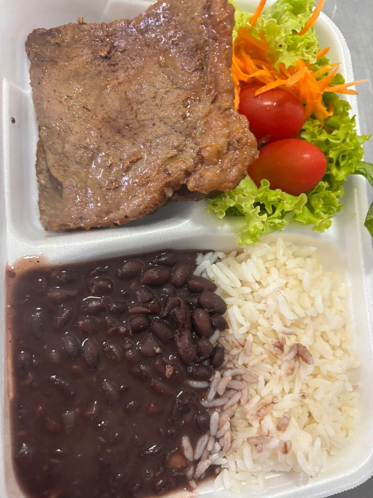 Marmita contendo arroz, feijão, salada e a Proteina Escolhida